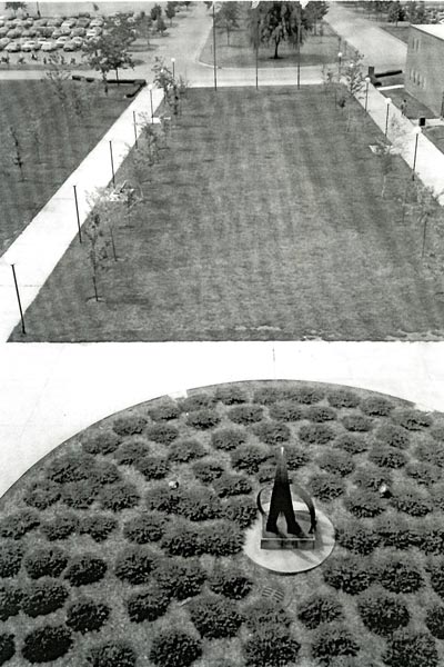 In the grass area south of the college’s main entrance, Horton prescribed specific varieties and placement of trees. He also recommended establishing tree groves in several locations, some with trees planted in honor of former trustees, retiring employees, and graduating student leaders. The groves would reduce the acreage of grass that required frequent mowing, thus cutting maintenance costs. Locating large groves west of the permanent buildings was selected to moderate the effects of prevailing westerly winds.